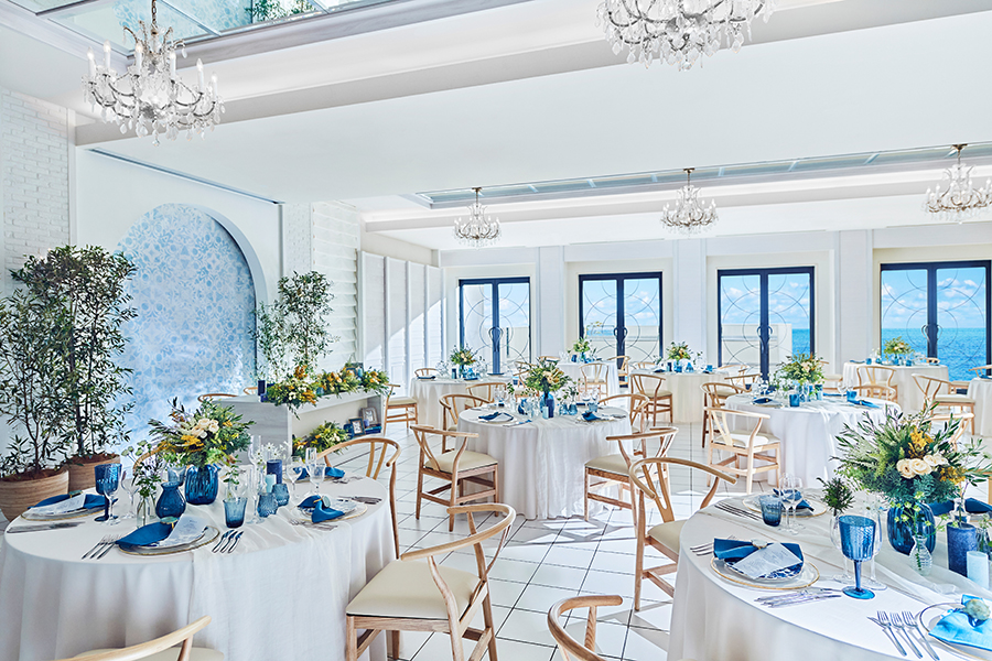 青い空と海を見晴らすオーシャンテラスと一続きになる「ラメール」。光を反射する白のしつらえにミコノスブルーのインテリアが映える空間です。海を背景にしたオープンキッチンでの多彩な料理演出をお楽しみいただけます。