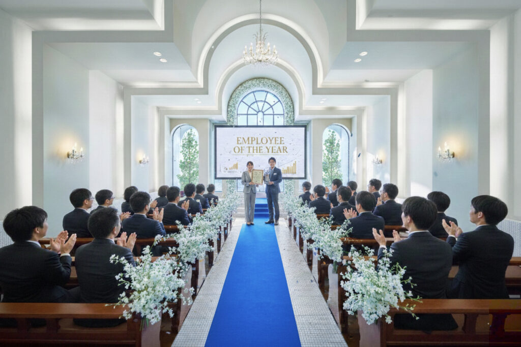 チャペルやパーティ会場を使った雰囲気ある表彰式が叶います。音響機材を用いた表彰演出、贈呈用花束やギフト、スイーツビュッフェのご用意も可能です