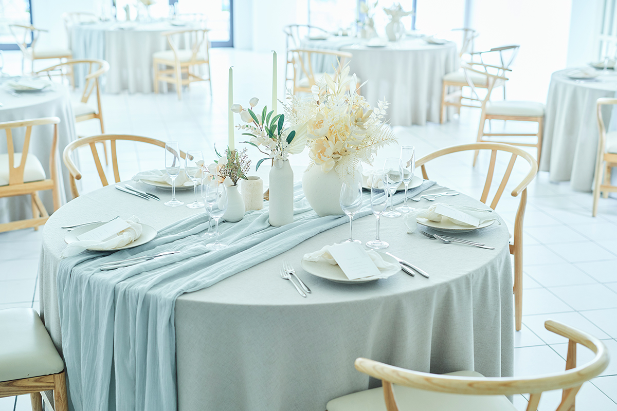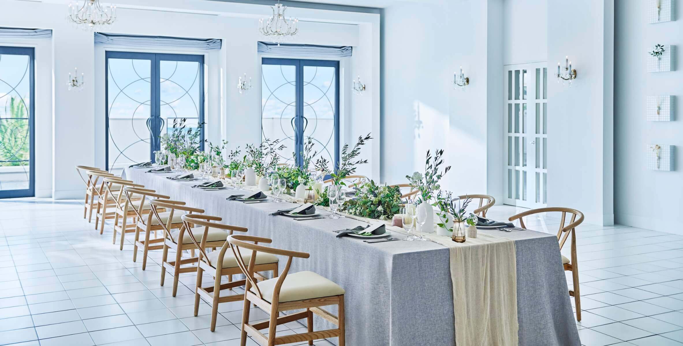 邸宅3階から見晴らす海の景色と、大桟橋の眺めが美しい、広々としたテラスとつながる少人数会場。自然素材のインテリアとやさしい色調のフラワーアレンジが調和し、誰もがゆったりとリラックスして過ごせる空間です。家族や親しい人たち、そして大切なペットとともに、会場もテラスも贅沢に貸切にして、心ゆくまでプライベートリゾートを体感いただけます。