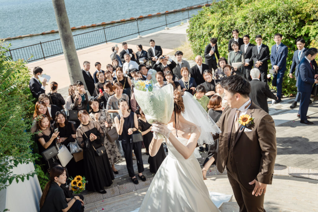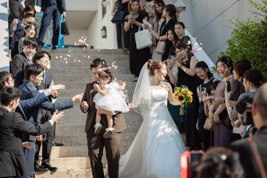 アフターセレモニーもお子様と一緒に大階段を歩き、ゲストのみなさまからの祝福の言葉と共に、花びらが舞う中お進みいただきます。