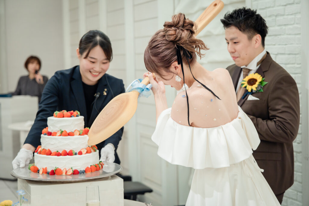 「一生美味しいお料理を作ります」と新婦様の愛情と気持ちを込め、いっぱいのケーキを新郎様のお口にお運びいただきました。